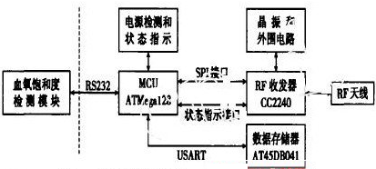 MCU部分是WPAN通信模塊的核心,完成通信模塊各組成部分的控制、協(xié)調(diào)和數(shù)據(jù)的加工。具體功能:通過RS232接口與血氧飽和度檢測模塊通信,實現(xiàn)對它的控制和配置,并接收檢測數(shù)據(jù);通過SPI接口和狀態(tài)指示接口實現(xiàn)對RF收發(fā)器的配置和檢測,并完成發(fā)射和接收的數(shù)據(jù)交換;通過USART接口與數(shù)據(jù)存儲器連接,完成數(shù)據(jù)存儲器的讀寫操作;通過電源檢測和狀態(tài)指示部分,監(jiān)測電源電壓情況,并能通過狀態(tài)指示產(chǎn)生報警提示。