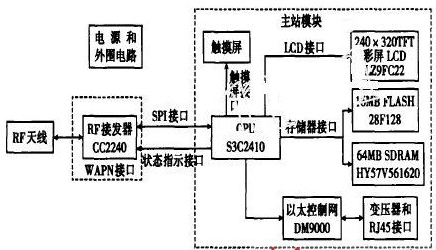 CPU部分完成主站各組成部分的控制、協(xié)調(diào)和數(shù)據(jù)的加工。具體功能:通過系統(tǒng)總線與存儲器相連,完成相關(guān)數(shù)據(jù)的加工、處理和存儲;通過LCD接口與彩色液晶顯示器相連,實現(xiàn)信息的顯示,以實現(xiàn)人機交互;通過觸摸屏接口與觸摸屏相連,實現(xiàn)控制命令的輸入;通過總線接口與以太網(wǎng)控制器相連,可將檢測儀接入后臺支持網(wǎng)絡(luò),實現(xiàn)系統(tǒng)信息的集中化管理和與后臺管理系統(tǒng)的融合;通過SPI接口和狀態(tài)指示接口實現(xiàn)對RF收發(fā)器的配置和檢測,并完成發(fā)射和接收的數(shù)據(jù)交換,實現(xiàn)與檢測儀移動終端的通信;通過電源和外圍電路,實現(xiàn)對系統(tǒng)的供電。