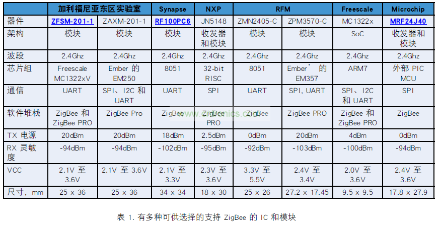IC 和模塊中都提供有 ZigBee 解決方案(見(jiàn)表1)。 商業(yè)使用本規(guī)范不收取費(fèi)用 - 制造商必須屬于 ZigBee 聯(lián)盟,最終產(chǎn)品必須