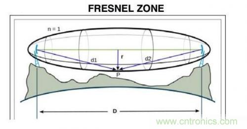 菲涅爾區(qū)是指無線電波離開天線后在可視距離周圍傳播的區(qū)域,如圖2所示。擁有視距對(duì)于保持強(qiáng)度有利,對(duì)于2.4GHz無線系統(tǒng)更是如此,原因在 于2.4GHz波易被水吸收。根據(jù)經(jīng)驗(yàn),必須有60%的菲涅爾區(qū)不存在障礙物。通常,20%的菲涅爾區(qū)被阻擋時(shí)幾乎不會(huì)引起鏈路信號(hào)損耗,而這一比例超過 40%時(shí)信號(hào)損耗將非常明顯。