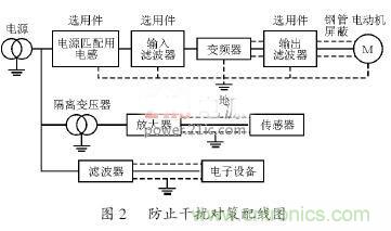 為了防止干擾,采用圖圓所示的方案。變頻器本身用鐵殼屏蔽,輸出線用鋼管屏蔽,并與其它弱電信號分別配線,附近的其它靈敏電子設(shè)備線路也要屏蔽;為了減少電磁噪聲,可以配置輸出濾波器;為了減少對電源的污染,可配置輸入濾波器或零序電感,還可與晶閘管整流裝置,功率因數(shù)補(bǔ)償器并聯(lián)使用。電源變壓器容量大于10倍變頻器容量,或電源電壓不平衡率超過3豫時需接電源匹配用電感器,采用電感后對電源改善效果良好,小容量變頻器安裝有匹配電感時使功率因數(shù)有提高,大容量時雖對功率因數(shù)無提高,但可改善變頻器運行,同時起到濾波作用。