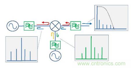 以下將組成測試電路對比傳統(tǒng)濾波器和無反射式濾波器分別配對相同混頻器的性能。