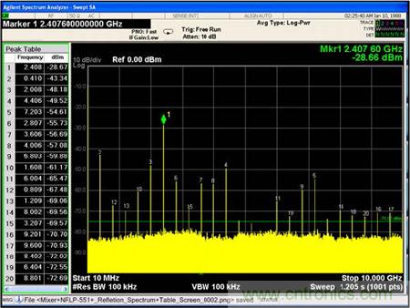 依照圖7所示測試電路,將測試3種不同狀態(tài)下從混頻器反射到源端的信號頻譜:
