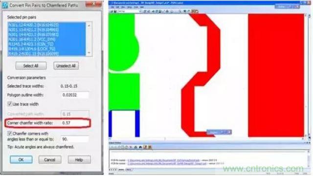 射頻和微波電路中經(jīng)常用到倒角,以減小饋線與電容器之間的分段不連續(xù)性電抗,從而改善MMIC 的頻率性能。90º 拐角與倒角之間的距離至關(guān)重要。因此,設(shè)計(jì)人員需要采用自動(dòng)方法來基于設(shè)計(jì)指定需要生成的倒角比率。PCB 設(shè)計(jì)工具如果能夠基于設(shè)計(jì)規(guī)則自動(dòng)強(qiáng)制實(shí)施需要生成的倒角比率,設(shè)計(jì)人員和工程師將會(huì)從中受益,在節(jié)省時(shí)間的同時(shí)提高設(shè)計(jì)質(zhì)量(圖3)。