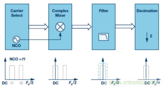 典型DDC模塊包括載波選擇、下變頻器、濾波器和抽取器。這些功能模塊按順序工作,或者可分別予以旁路,最終根據(jù)后續(xù)FPGA或ASIC(其采樣速率較低)的要求,產(chǎn)生一個位于DC的復信號或一個實信號。