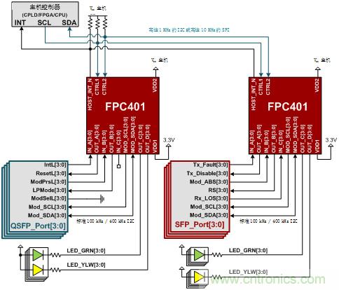 FPC401將多達(dá)56個(gè)端口的所有低速信號(hào)集成到單個(gè)快速I(mǎi)2C總線(高達(dá)1MHz)或串行外設(shè)接口(SPI)總線(高達(dá)10 MHz)中,大大降低了線路復(fù)雜性并簡(jiǎn)化了設(shè)計(jì)可擴(kuò)展性。FPC401四個(gè)端口中的每一個(gè)端口都具有三個(gè)輸入、四個(gè)輸出和一個(gè)I2C主機(jī),從而實(shí)現(xiàn)對(duì)下游模塊的完全控制。有關(guān)SFP和QSFP連接的示例,請(qǐng)參見(jiàn)圖2。