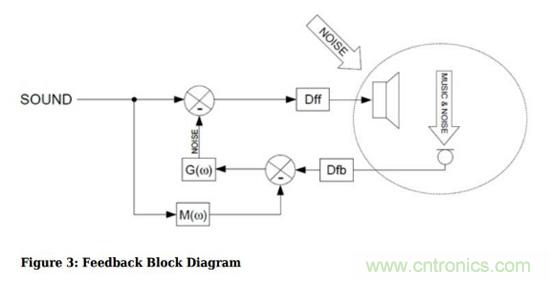 在反饋有源噪聲消除方案中,麥克風(fēng)采樣的不是直接的環(huán)境噪聲,而是耳機輸出處的聲音,顯然這里的聲音包括了音樂和環(huán)境噪聲。那么如何選擇性地抵消掉噪聲但是保留音樂呢?就需要把這里采樣到的聲音減去音樂,這樣剩下的信號就全是噪聲了;然后再根據(jù)這個噪聲去產(chǎn)生噪聲抵消信號。這樣做的話,就不會有風(fēng)噪問題。然而,這里又有一個新問題,就是反饋系統(tǒng)通常帶寬會遠小于前饋系統(tǒng),因此使用反饋模式的有源噪聲消除對于高頻噪聲的抵消作用有限。