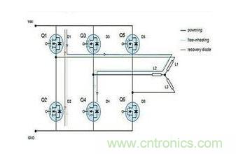 標(biāo)準(zhǔn)的三相功率級(jí)(power stage)被用來驅(qū)動(dòng)一個(gè)三相無刷直流電機(jī),如圖1所示。功率級(jí)產(chǎn)生一個(gè)電場,為了使電機(jī)很好地工作,這個(gè)電場必須保持與轉(zhuǎn)子磁場之間的角度接近90°。六步序列控制產(chǎn)生6個(gè)定子磁場向量,這些向量必須在一個(gè)指定的轉(zhuǎn)子位置下改變?;魻栃?yīng)傳感器掃描轉(zhuǎn)子的位置。為了向轉(zhuǎn)子提供6個(gè)步進(jìn)電流,功率級(jí)利用6個(gè)可以按不同的特定序列切換的功率MOSFET。下面解釋一個(gè)常用的切換模式,可提供6個(gè)步進(jìn)電流。