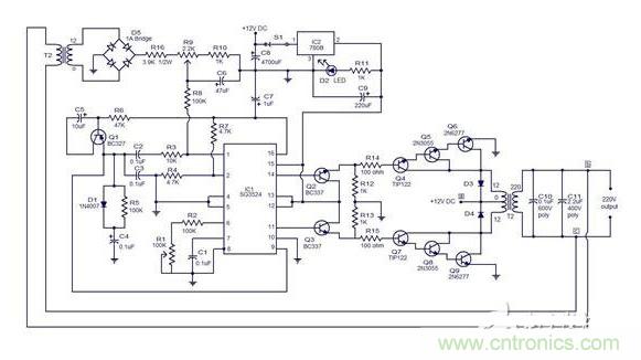 此誤差電壓成正比的輸出電壓所需的值和IC調(diào)節(jié)占空比的驅(qū)動(dòng)信號(hào)(引腳14和12)為了使輸出電壓為所需的值的變化。R9的預(yù)設(shè),可用于調(diào)節(jié)逆變器輸出電壓,因?yàn)樗苯涌刂谱冾l器的輸出電壓誤差放大器部分的反饋量。