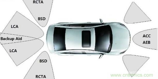 應(yīng)用于汽車的防撞雷達一般工作在兩個頻段:24GHz-24.25GHz和76GHz-81GHz;工作在24GHz頻段的防撞雷達一般安裝在汽車后向,實現(xiàn)盲區(qū)監(jiān)測(BSD),變道輔助(LCA)以及倒車側(cè)向警告(RCTA)等功能;工作在76GHz-81GHz頻段的毫米波防撞雷達一般安裝在汽車前向,用于實現(xiàn)自適應(yīng)巡航(ACC),緊急制動(AEB)等功能。汽車防撞雷達不同功能覆蓋區(qū)域如圖1所示: