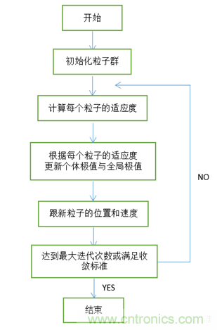 粒子群的基本概念是來自于鳥群覓食行為的研究[3]。與遺傳算法類似,粒子群算法也是一種隨機搜索方法,不同的是,粒子群優(yōu)化算法沒有選擇、交叉、變異等復(fù)雜過程,而是依靠個體間的協(xié)作來尋取最優(yōu)解。每個粒子通過跟蹤粒子本身找到的最優(yōu)解Pbest和群體找到的最優(yōu)解Gbest,更新離子的位置和速度,不斷向最優(yōu)解靠近,最終達到最優(yōu)解。粒子群算法優(yōu)化流程圖如圖7所示