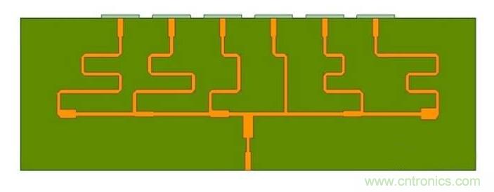 3.2節(jié)確定了各線陣激勵的幅相值,但圖8里的仿真方向圖是理想的,現(xiàn)實中需要通過1分6的功分網(wǎng)絡(luò)來將其實現(xiàn)。常用的功分器有Wilkinson功分器和T型節(jié)功分器;Wilkinson功分器只能組成并饋網(wǎng)絡(luò),這種網(wǎng)絡(luò)具有較大的損耗且占用面積大,不利于小型化;而由T型節(jié)組成的串饋功分網(wǎng)絡(luò)具有損耗低占用面積小的優(yōu)勢,更適合于實現(xiàn)3.2節(jié)中波束賦形的幅相激勵。