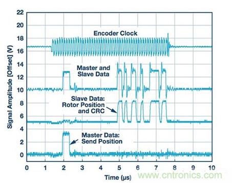 圖6顯示了EnDat系統(tǒng)的測(cè)試結(jié)果。測(cè)試使用的時(shí)鐘頻率為8 MHz,延遲補(bǔ)償通過(guò)接收時(shí)鐘相移實(shí)現(xiàn)。底部信號(hào)是來(lái)自EnDat主機(jī)的命令。此處顯示的命令為“發(fā)送位置”,其前面是兩個(gè)0,接著是六個(gè)1,最后又是兩個(gè)0。該命令總共有10位。編碼器的響應(yīng)是從頂部起的第三個(gè)信號(hào)。合并數(shù)據(jù)線是從頂部起的第二個(gè)信號(hào)。最后,頂部信號(hào)是施加于編碼器的時(shí)鐘。