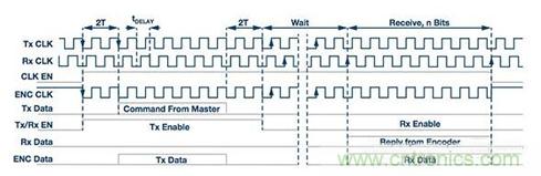 來(lái)自處理器的時(shí)鐘信號(hào)是連續(xù)的,而EnDat協(xié)議規(guī)定,時(shí)鐘只能在通信期間施加于編碼器。在所有其他時(shí)候,時(shí)鐘線路必須保持高電平。為此,處理器產(chǎn)生一個(gè)時(shí)鐘使能信號(hào)CLK EN,其被送至ADM3065E數(shù)據(jù)使能引腳。恰好兩個(gè)時(shí)鐘周期(2T)之后,主機(jī)開(kāi)始在Tx DATA上發(fā)出命令。