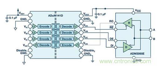 RS-485信號(hào)傳輸是平衡的差分式傳輸,本身便能抗干擾。系統(tǒng)噪聲均等地耦合到RS-485雙絞線電纜中的每條導(dǎo)線。一個(gè)信號(hào)的發(fā)射與另一個(gè)信號(hào)相反,耦合到RS-485總線的電磁場(chǎng)彼此抵消。這降低了系統(tǒng)的電磁干擾(EMI)。此外,ADM3065E增強(qiáng)的2.1 V驅(qū)動(dòng)強(qiáng)度支持在通信中實(shí)現(xiàn)更高的信噪比(SNR)。給ADM3065E增加信號(hào)隔離可利用ADuM141D輕松實(shí)現(xiàn)。ADuM141D是一款采用ADI公司iCoupler®技術(shù)的四通道數(shù)字隔離器。ADuM141D的工作數(shù)據(jù)速率最高可達(dá)150 Mbps,因此它適合與50 Mbps ADM3065E RS-485收發(fā)器一起工作(參見(jiàn)圖2)。直接功率注入(DPI)法測(cè)量器件抑制注入到電源或輸入引腳的噪聲的能力。ADuM141D采用的隔離技術(shù)已通過(guò)測(cè)試,符合DPI IEC 62132-4標(biāo)準(zhǔn)。ADuM141D抗擾度性能超過(guò)同類(lèi)產(chǎn)品。ADuM141D在整個(gè)頻率范圍內(nèi)保持了出色的性能,而其他隔離產(chǎn)品在200 MHz至700 MHz頻段出現(xiàn)位錯(cuò)誤。