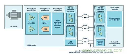 【導(dǎo)讀】旋轉(zhuǎn)編碼器廣泛用于工業(yè)自動(dòng)化系統(tǒng)中。此類(lèi)編碼器的典型應(yīng)用是電力機(jī)械,其中編碼器連接到旋轉(zhuǎn)軸,從而向控制系統(tǒng)提供反饋。雖然編碼器的主要用途是角度位置和速度測(cè)量,但系統(tǒng)診斷和參數(shù)配置等其他特性也很常見(jiàn)。圖1顯示了一個(gè)電機(jī)控制信號(hào)鏈,其利用RS-485收發(fā)器和微處理器連接絕對(duì)編碼器(ABS編碼器)從機(jī)和工業(yè)伺服驅(qū)動(dòng)器主機(jī),以實(shí)現(xiàn)對(duì)交流電機(jī)的閉環(huán)控制。