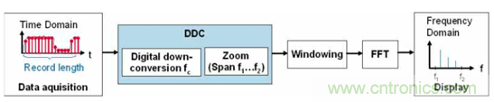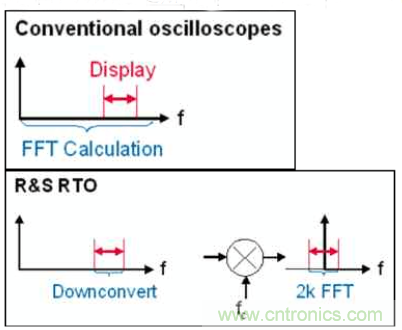 傳統(tǒng)的做法是,示波器把信號(hào)樣本采集下來(lái),然后通過(guò)軟件算法來(lái)進(jìn)行軟件運(yùn)算,速度非常慢,我們的方式通過(guò)專(zhuān)用的硬件加速集成電路(ASIC),把fft 功能交給這個(gè)硬件電路來(lái)實(shí)現(xiàn),速度快到幾乎不影響原始波形的刷新速率。當(dāng)然這個(gè)ASI 是需要花大把銀子來(lái)研發(fā)的。核心對(duì)比用到了專(zhuān)用的DDC 電路。