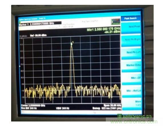 從測試結(jié)果來看,諧波超標(biāo)很嚴(yán)重,這一點(diǎn)與天線區(qū)域的雜訊信號很相似,考慮到傳導(dǎo)嫌疑已經(jīng)排除,因此分析的重點(diǎn)集中到了天線區(qū)域的非線性器件。從如圖4所示原理圖可以看出,天線的調(diào)諧開關(guān)是正常工作的,由于天線開關(guān)本身是非線性器件,因此首先確認(rèn)天線開關(guān)的影響。將天線開關(guān)旁路(天線仍然正常)如圖5所示,發(fā)現(xiàn)此時2.55GHz的雜訊可以降低到-55.7dBm左右,因此可以確定天線區(qū)域的雜訊就是調(diào)諧開關(guān)造成的。