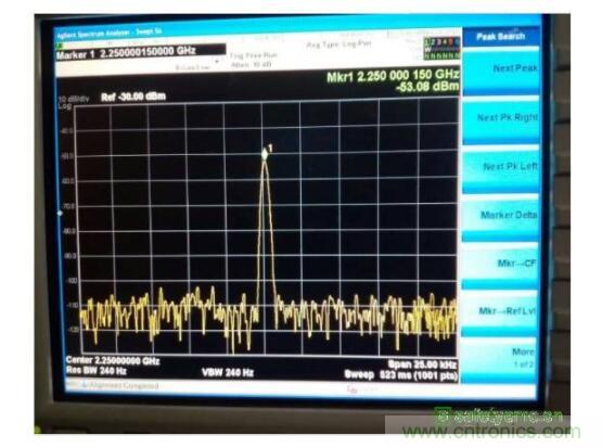 針對輻射問題,我們要尋找出干擾的噪聲,使用頻譜分析儀在頻域分析會更快速精準(zhǔn)的找出方案。這里我們使用性價比較高的CXA N9000A頻譜分析儀,搭配使用N9311X 套件中的磁場環(huán)形探針來掃描手機(jī)的近場雜訊。通過使用較低靈敏度的環(huán)形探頭可以發(fā)現(xiàn)在天線區(qū)域存在較大的諧波,如圖3所示 2.55GHz峰值達(dá)到了 -43.29dBm。
