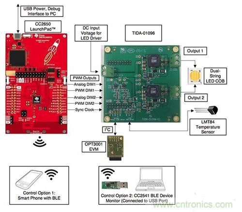 圖 5 顯示了如何使用與 SimpleLink CC2650 LaunchPad 配對的 TIDA-01096 來配置基于參考設(shè)計的 LED 照明解決方案的硬件。該項目的固件是由 TI 作為代碼調(diào)試器項目開發(fā)的,可根據(jù)要求提供。
