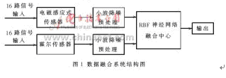 多傳感器數(shù)據(jù)融合在運(yùn)用過程的各階段(例如模型建立、特征提取、目標(biāo)識(shí)別等)需要各種各樣的傳感器。由于沒有哪一類傳感器的各種性能指標(biāo)都絕對(duì)比其他類型傳感器好,因此在一個(gè)系統(tǒng)中,需要同時(shí)采用多種類型的傳感器,以提高系統(tǒng)檢測(cè)、識(shí)別、分類和決策能力。本文根據(jù)系統(tǒng)的需要使用了兩類傳感器:電磁感應(yīng)式傳感器和霍爾傳感器,利用它們之間產(chǎn)生的冗余信息進(jìn)而檢測(cè)出缺陷信號(hào)。數(shù)據(jù)融合系統(tǒng)結(jié)構(gòu)如圖1所示。