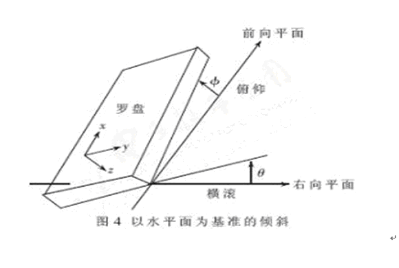 地球磁場的強度為0.6高斯左右,現(xiàn)有的磁阻傳感器可以很好地測量地磁場范圍內的磁場強度。由于二維羅盤只能在保持水平的情況下正常工作,如果用于車輛的動態(tài)環(huán)境中,將不可能保證其永遠水平,所以在這種場合下,羅盤的可使用性大大降低。于是需要設計三維羅盤以適應各種姿態(tài)的測量。三維電子羅盤的總體設計方案如圖3所示。三軸磁阻傳感器分別從X、Y、Z 三個磁場強度方向輸出電壓,經過放大電路分別輸入到三個具有A/D轉換能力的MCU端口,二軸加速度傳感器測量俯仰角度和橫滾角度,測量參數(shù)的意義如圖4所示。