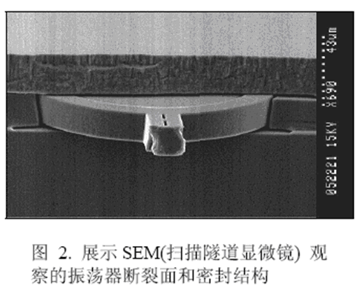 圖2是工藝在接觸與金屬化之前產(chǎn)生的完整的掃描隧道顯微鏡(SEM)結(jié)構(gòu)圖,從中可看到封裝與諧振器的晶圓表面和剖面結(jié)構(gòu)。