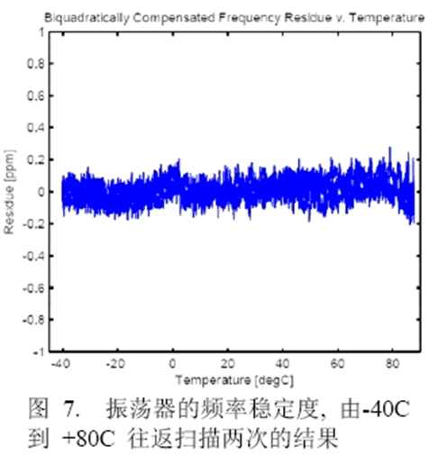 圖7為補償后的頻率穩(wěn)定性數(shù)據(jù), 溫度從-40℃到+85℃范圍內(nèi)掃描兩次并返回到-40℃。整個溫度范圍的總頻率誤差小于100ppm (200ppm測量噪底,30ppm測量誤差),遲滯大約小于50ppm。