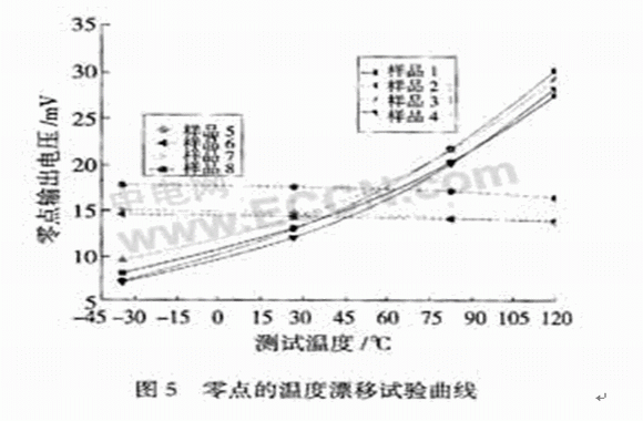 由于芯片對所處環(huán)境的要求比較特殊,所以與硅芯片接觸的硅油需要具備以下特點:良好的介電性能、盡可能小的熱脹系數(shù)、化學(xué)穩(wěn)定性好以及耐熱和耐寒性能好。硅油的凈化處理是薄膜隔離式壓力傳感器封裝中至關(guān)重要的工藝步驟,因為若凈化不干凈,硅油或傳感器受壓部分的充油腔內(nèi)就會混有氣體、水分等可壓縮、易揮發(fā)的物質(zhì),在全溫區(qū)內(nèi)的體積變化就會沒有規(guī)律可言,造成外界的待測壓力不能準(zhǔn)確、規(guī)則地傳遞到芯片,從而使得壓力傳感器的溫漂比較嚴(yán)重。這種現(xiàn)象反映在零點的溫漂上,可以用來評價封裝的好壞。通常,由于在恒壓源激勵的情況下壓力傳感器的靈敏度溫度系數(shù)為負(fù)值,所以壓力傳感器的零點稍有下降,如圖5的樣品5,6,7,8所示;而硅油凈化不充分的壓力傳感器零點的溫漂卻非常大,且隨著溫度的升高而升高,如圖5中的樣品1,2,3,4所示。試驗表明,像樣品1,2,3,4這類溫漂很大的傳感器的溫度補(bǔ)償是比較困難的,所以封裝時必須確保硅油品質(zhì)和填充量恰到好處。