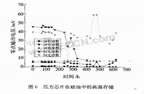 1#,2#,3#涂敷了保護(hù)層,4#,5#沒有涂敷保護(hù)層??梢钥吹?,沒有保護(hù)層的傳感器在高溫下存儲了約200 h后,它的零點突然發(fā)生了變化,之后數(shù)據(jù)不穩(wěn)定;涂了保護(hù)層的壓力傳感器的零點在600多小時后仍然很穩(wěn)定。因此,為了防止硅油的污染導(dǎo)致壓力傳感器的失效,我們采取了一些必要的措施。首先,選擇高溫下盡可能穩(wěn)定的硅油;其次,盡量選擇具有良好鈍化層的芯片;最后,在不影響靈敏度的前提下,還可以在封裝過程中對芯片以及引線進(jìn)行涂敷鈍化層的處理。