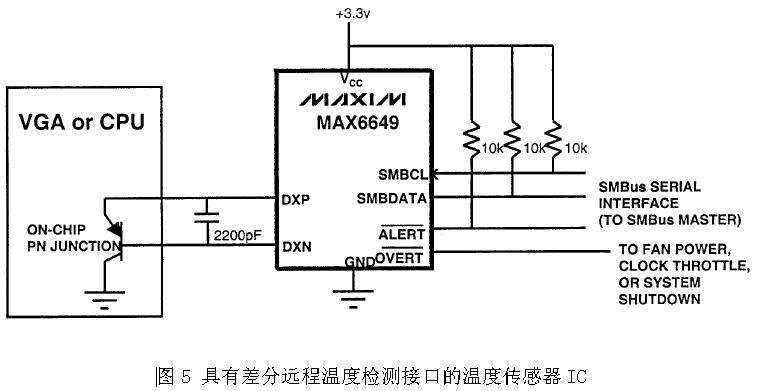 圖5為筆記本電腦普遍使用的一種溫度控制方案。溫度傳感器IC通過SMBus接口連接到筆記本電腦的嵌入式微控制器,由于溫度傳感器IC與嵌入式微控制器之間為數字接口,因此溫度傳感器IC在位置上可以遠離嵌入式微控制器而不會有噪聲干擾問題。MAX6649同時內置一個本地溫度傳感器和用于連接遠端二極管的差分接口。MAX6649的IDH=100uA,IDL=10uA,高精度、小電流的電流源可減小因雜散電阻所產生的測量誤差。差分輸入有助于降低噪聲干擾。圖5所示電路,溫度傳感器IC只負責溫度檢測,風扇轉速控制由嵌入式微控制器完成,由軟件實現。為了避免軟件控制的死機問題,MAX6649還集成了保護功能,當溫度到達第一個高溫臨界點時,MAX6649 ALERT可發(fā)出中斷請求,要求嵌入式微控制器進行相應的處理,例如對處理器進行降頻;如果上述對策仍無法有效抑制溫度的上升,當溫度達到第二高溫臨界點時,MAX6649 OVERT可以用來控制系統(tǒng)的第二個風扇或對系統(tǒng)進行強制關機。圖5具有低成本、高精度、使用彈性大等優(yōu)點,但在軟件的設計上需花費較多的功夫。