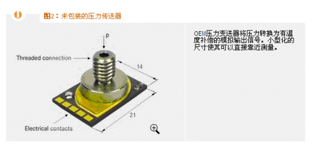創(chuàng)新的傳感器包裝由多層陶瓷(LTCC或HTCC)制成。這樣,整個信號處理電路的電氣互連都可以合并在陶瓷層中。測量信號由信號傳感器放大,該傳感器通過單獨編程補償靜態(tài)傳感器故障。壓力變送器的輸出信號與標(biāo)準(zhǔn)化的界面一致,變化范圍介于0.5 V至4.5 V。這樣可以保證向信號處理單元的傳送具有足夠的抗干擾性。無需使用其它信號處理電路板。圖2顯示的是具有所有壓力測量和信號處理所需元件的OEM傳感元件。