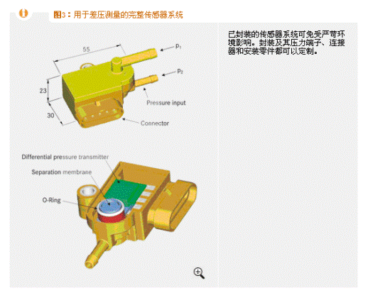 如果將壓力變送器用作獨立測量系統(tǒng),必須保護其免受外部環(huán)境影響,如在其結(jié)合處附件的灰塵和水霧。這一點是通過使用在大多數(shù)應(yīng)用中都具有良好的媒介抵抗性和充分的溫度穩(wěn)定性的塑料封裝實現(xiàn)的。該封裝及其壓力端子、連接器和安裝零件都適合客戶定制(圖3)。對于要求極高的應(yīng)用,還可以提供不銹鋼封裝版本。應(yīng)用包括測量差壓、監(jiān)測腐蝕性氣體濾波器和測量冷卻劑壓力。