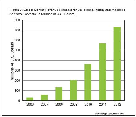圖3所示為iSuppli公司對(duì)于2006-2012年全球面向手機(jī)的慣性與磁性傳感器市場(chǎng)預(yù)測(cè)。