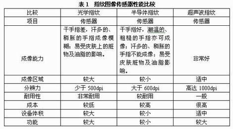 為克服物理方式的缺點(diǎn),開(kāi)發(fā)的光學(xué)傳感器、半導(dǎo)體傳感器、超聲波傳感器等對(duì)獲取高質(zhì)量指紋圖 像提供了良好的技術(shù)保障,具有很好實(shí)用價(jià)值。同時(shí),更先進(jìn)的指紋圖像傳感器亦在研發(fā),目的是獲得足夠的指紋細(xì)節(jié),并使指紋圖像達(dá)到較高分辨力,提高指紋識(shí) 別準(zhǔn)確性、可靠性。本文主要介紹各種指紋圖像傳感器技術(shù)關(guān)鍵、性能特點(diǎn),并簡(jiǎn)要介紹其應(yīng)用情況及發(fā)展趨勢(shì)。