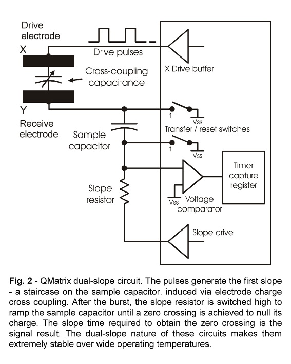 QMatrix器件采用一個掃描式的橫向電極無源矩陣,實現了使用單芯片驅動的大量觸摸按鍵。這種構造可提高感測芯片的引腳利用效率,較之于每個按鍵都需要一個感測連接 (如 Qtouch™ 及許多同類器件),芯片和按鍵矩陣之間所需的連接數量較少。QMatrix 器件所需的部件最少,最大限度地降低了單個按鍵的成本。在量產時,此器件可以令芯片成本降至每按鍵 0.05 美元。此外,這種構造本身就具有抵抗環(huán)境變化、水膜影響以及無線電干擾的特性。