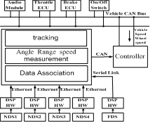 數(shù)據(jù)融合系統(tǒng)采用分布式體系結(jié)構(gòu),即每個(gè)近距離傳感器對獲得的回波信號先進(jìn)行局部處理,然后送入融合中心進(jìn)行融合以獲得目標(biāo)的方位、速度信息??刂破魇钦麄€(gè)雷達(dá)網(wǎng)絡(luò)系統(tǒng)的最終決策機(jī)構(gòu),它負(fù)責(zé)識別目標(biāo)的距離和速度信息是否對行車安全構(gòu)成威脅,并通過聲光的形式提示駕駛員或者直接作用于車載控制系統(tǒng)加以調(diào)整。