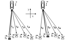 對于本文所討論的雷達(dá)網(wǎng)絡(luò)系統(tǒng)而言,四個(gè)近距離雷達(dá)傳感器即是發(fā)射機(jī)又是接收機(jī)。如圖6所示,通過電掃開關(guān)的控制,其中的一個(gè)NDS擔(dān)當(dāng)發(fā)射機(jī),反射信號被四個(gè)NDS同時(shí)接收。經(jīng)過信號處理之后,因各個(gè)NDS之間位置的不同,可以得到四組關(guān)于被測目標(biāo)的距離和相對速度值(r1,1v1,1)、(r1,2v1,2)、(r1,3v1,3)、(r1,4v1,4)。這種采用單基地發(fā)射多基地接收的雷達(dá)網(wǎng)絡(luò)體制,盡管對傳感器之間的時(shí)間同步控制要求很高,但是可以避免鄰近傳感器之間的相互干擾。