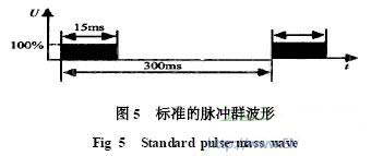電磁兼容設(shè)計(jì)靠電磁兼容試驗(yàn)來(lái)驗(yàn)證與改進(jìn)?,F(xiàn)在,有了比較完善的電磁兼容試驗(yàn)方法和專門的試驗(yàn)設(shè)備。開(kāi)關(guān)電器動(dòng)作時(shí),形成強(qiáng)烈的干擾,產(chǎn)生瞬態(tài)脈沖。IEC61000-4-4標(biāo)準(zhǔn)對(duì)電快速瞬變脈沖干擾作出規(guī)定,分為單個(gè)脈沖、一群脈沖、脈沖群。脈沖群波形如圖5所示,周期為300ms,脈沖束寬度為15ms。