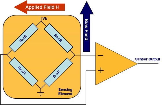 當在一個很薄的鐵條上施加磁力線方向與經過鐵條的電流方向垂直的磁場時,鐵條內的電阻就會發(fā)生變化。這種傳感器通常采用單臂電橋形式,如圖所示,電橋由靜態(tài)阻值相同的磁阻構成。在測量過程中,電橋上施加電壓Vb,使電流通過電阻。只要磁場H存在,在兩組四個相反放置的電阻器中,第一組兩個電阻的磁化矢量轉向電流,使電阻值變大;而另兩個電阻的磁化矢量背離電流,使電阻值變小。在線性范圍內,傳感器輸出與所施加的磁場強度成正比。