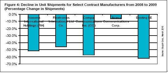 對于富士康、偉創(chuàng)力、仁寶通訊、華冠通訊和Elcoteq SE等重要廠商來說,2009年出貨量實際上大減了一半,突顯手機合同制造商面臨極大的困難。圖4所示為2008至2009年部分合同制造商出貨量下降百分比。