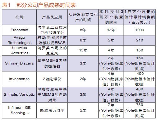 新興MEMS的特點是,達到成熟的速度較以往更快(表1)。