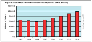 預(yù)計(jì)今年MEMS市場將增長11 .1%,達(dá)到65.54億美元,略高于2007年創(chuàng)下的高點(diǎn)65.50億美元。該市場之前兩年呈下降態(tài)勢,是其較短歷史中的首次下降,2008年銷售額下降到63億美元,2009年進(jìn)一步降到59億美元。