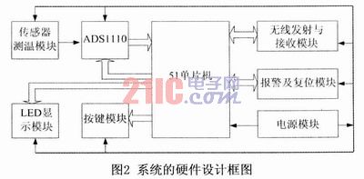 此基于EL-700鉑熱電阻傳感器的高精度測溫裝置既可以單機(jī)工作,又可以通過無線收發(fā)模塊實現(xiàn)與計算機(jī)之間的無線數(shù)據(jù)傳輸,把采集到的溫度信號送到計算機(jī)中進(jìn)行分析、處理及打印,從而實現(xiàn)數(shù)據(jù)的遠(yuǎn)距離傳輸與處理。測溫裝置主要由溫度信號的檢測與采集電路、LED顯示、按鍵控制、電源、報警及復(fù)位、無線發(fā)射與接收等功能模塊組成,每一個電路模塊完成一定的功能,測溫裝置的硬件總體組成框圖如圖2所示。