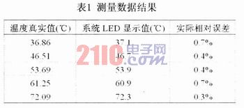 試驗數(shù)據(jù)通過對普通熱水器加熱中的水溫進(jìn)行測量取得,測量中采用實驗用高精密數(shù)字測溫儀的示值溫度作為被測物體溫度檢測點的溫度真實值,本測溫裝置測得的溫度信息經(jīng)過電路的轉(zhuǎn)換及單片機(jī)的處理后,測得的溫度信息在LED數(shù)碼管上的顯示值如表l所示。從表中的數(shù)據(jù)可以看出,本系統(tǒng)LED顯示值和真實值很接近;試驗過程中,由于測量環(huán)境及其它因素的影響,使得系統(tǒng)的測量值在真實值上下波動,但溫度的實際相對誤差始終保持在1%以內(nèi),從而證明了本測溫裝置完全能夠滿足實際的測量要求。
