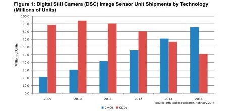 據(jù)IHS iSuppli公司的研究,數(shù)碼相機CMOS圖像傳感器出貨量未來三年將快速增長,到2013年將首次超過CCD。