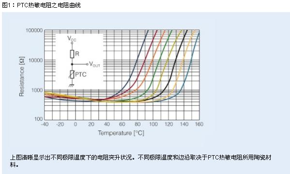 PTC熱敏電阻具有非線性特性:在低溫例如環(huán)境溫度條件下,其電阻較低。隨著溫度的升高,其電阻基于所用陶瓷材料將會突升。這一閾值又稱作參考溫度或極限溫度。圖1所示為PTC熱敏電阻典型特性。