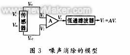 傳感器電路首先需要將采樣的微弱信號進(jìn)行放大。但同時(shí)并存許多噪聲源:傳感器內(nèi)阻、電纜電阻、放大器電路以及電路周圍的電磁干擾源。因此,通常用低通濾波器和差分放大器等來抑制差模噪聲和共模噪聲(如圖3所示)。