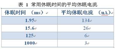 CY8C22x45系列芯片休眠時的工作電流僅有3uA[5],芯片內(nèi)包含一個休眠計數(shù)器,系統(tǒng)進入休眠后計數(shù)器開始遞減,當計數(shù)值為零時產(chǎn)生中斷喚醒系統(tǒng)。喚醒系統(tǒng)后可以不做任何處理再次進入休眠模式。這樣周而復始,達到所需要的整個休眠時間。在實際設計中,常常使用平均休眠電流替代公式2中的Isleep,即在每次休眠結束后,僅讓系統(tǒng)正常工作最短時間,該時間內(nèi)完成所有必須操作(僅是一次循環(huán)判斷),此時的電流即為該休眠時間下的平均休眠電流。表1列出了常用休眠時間的平均休眠電流。