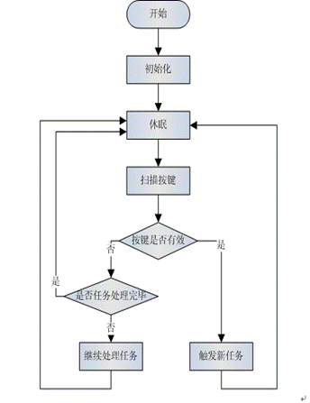 圖3是一個具有休眠功能的復雜系統(tǒng)軟件流程圖。此方法是將以上方法中的任務處理進行分解,分為觸發(fā)新任務,處理任務。目的就是減小在每個循環(huán)周期內(nèi)部執(zhí)行任務的所花費的CPU資源。與上一個方法的不同在于:系統(tǒng)喚醒掃描按鍵程序,當判斷按鍵有效時,觸發(fā)新任務,并不是將所有的任務處理完畢。在當前的循環(huán)周期內(nèi),觸發(fā)的新任務可能沒有處理完畢,需要下一個或者更多個系統(tǒng)循環(huán)的時間才可以完成。當判斷按鍵無效時,不是馬上進入休眠模式,而是判斷是否有沒有處理完畢的任務。如果有則繼續(xù)處理;如果沒有則進入休眠模式。此方法可以處理比較復雜的任務,能滿足更多應用領域的需求。